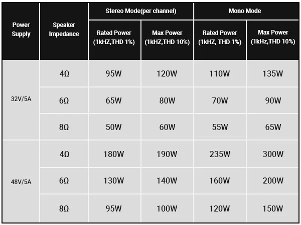 180Wx2 @4Ω Stereo(with 48v power supply)