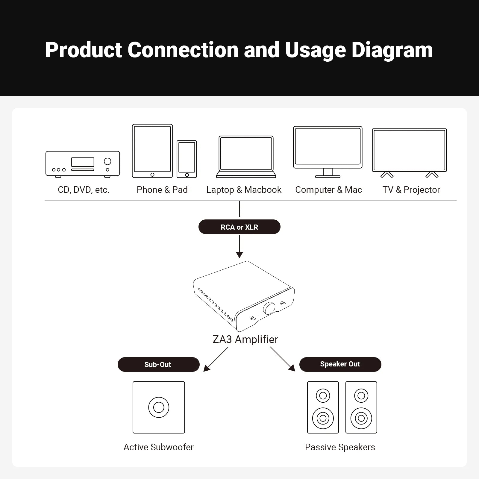 • Audiophile-Grade Components: The ZA3 features the TPA3255 high-end Class-D amp chip and utilizes premium Japanese NCC, ELNA, and German WIMA capacitors, and Japanese Sumida inductors for exceptional audio quality. With a SINAD rating of up to 89dB, an SNR of up to 106dB, and a low noise floor of only 150μV, it delivers exceptional clarity and low distortion.